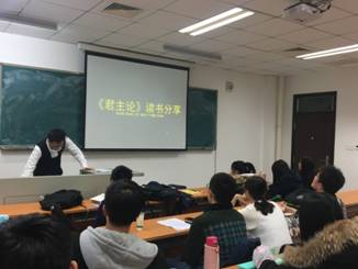 活动开始后,班长窦其禹简要介绍分享会的具体流程及纪律要求以保证分享会的顺利进行。第一位上场分享的朱光照给大家讲述了本小组对《君主论》这本书的心得体会,他通过作者马基雅维利对于“德能”一词的阐述来分析其对君主制、共和制的态度,接着以作者的个人作品所表现的思想倾向为基,认为马基雅维利在字里行间表现出对共和制的认同。