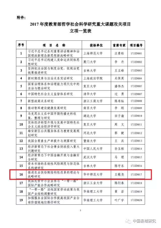 (通讯员 王静文)12月26日,教育部社会科学司正式公示了2017年度教育部哲学社会科学研究重大课题攻关项目立项名单,经过专家评审和公示阶段,我院博士生导师、中国县域发展研究中心主任王敬尧教授申报的“推进农业供给侧结构性改革的理论与战略研究”获批立项!