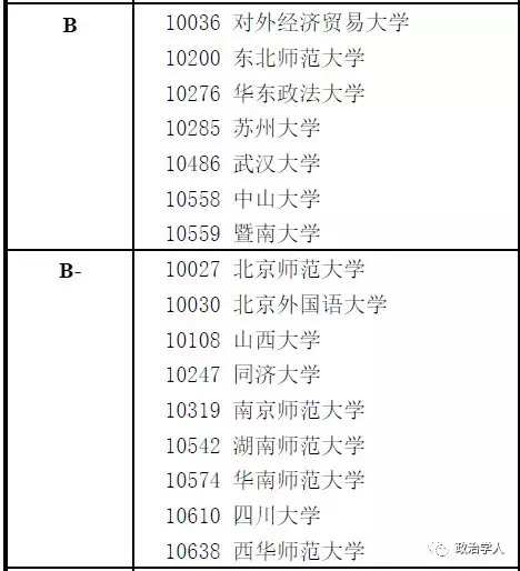 (通讯员 王静文)12月28日,教育部学位与研究生教育发展中心首次采用“分档”方式公布了全国第四轮学科评估结果,我校政治学一级学科被评为A类,排名第四。 本次学科评估中仅有北京大学和复旦大学评估结果为A+,共有7所高校政治学学科评估结果为A类。 下附评估结果榜单: