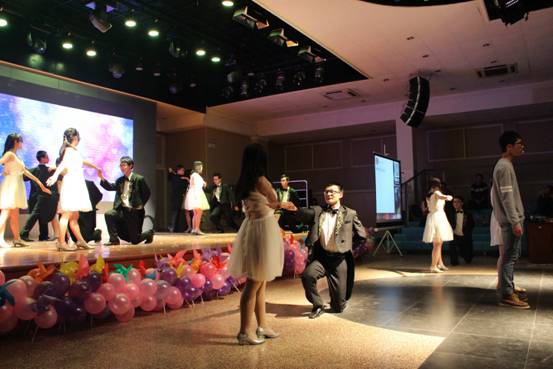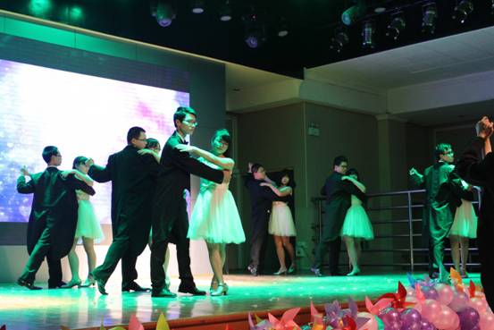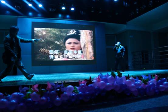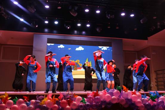 接下来的演出令大家惊喜不断,当主持人神秘地讲到“邀请段书记、唐院长、韦院长、胡院长、高主席等领导上台为大家表演热舞”的时候,全场一片惊呼,酷炫的灯光下各位“领导”跳起了欢快的舞蹈——原来是同学们带着印有老师们面庞的面具在台上舞蹈,神曲配上搞笑的舞姿给大家留下了深刻的印象。