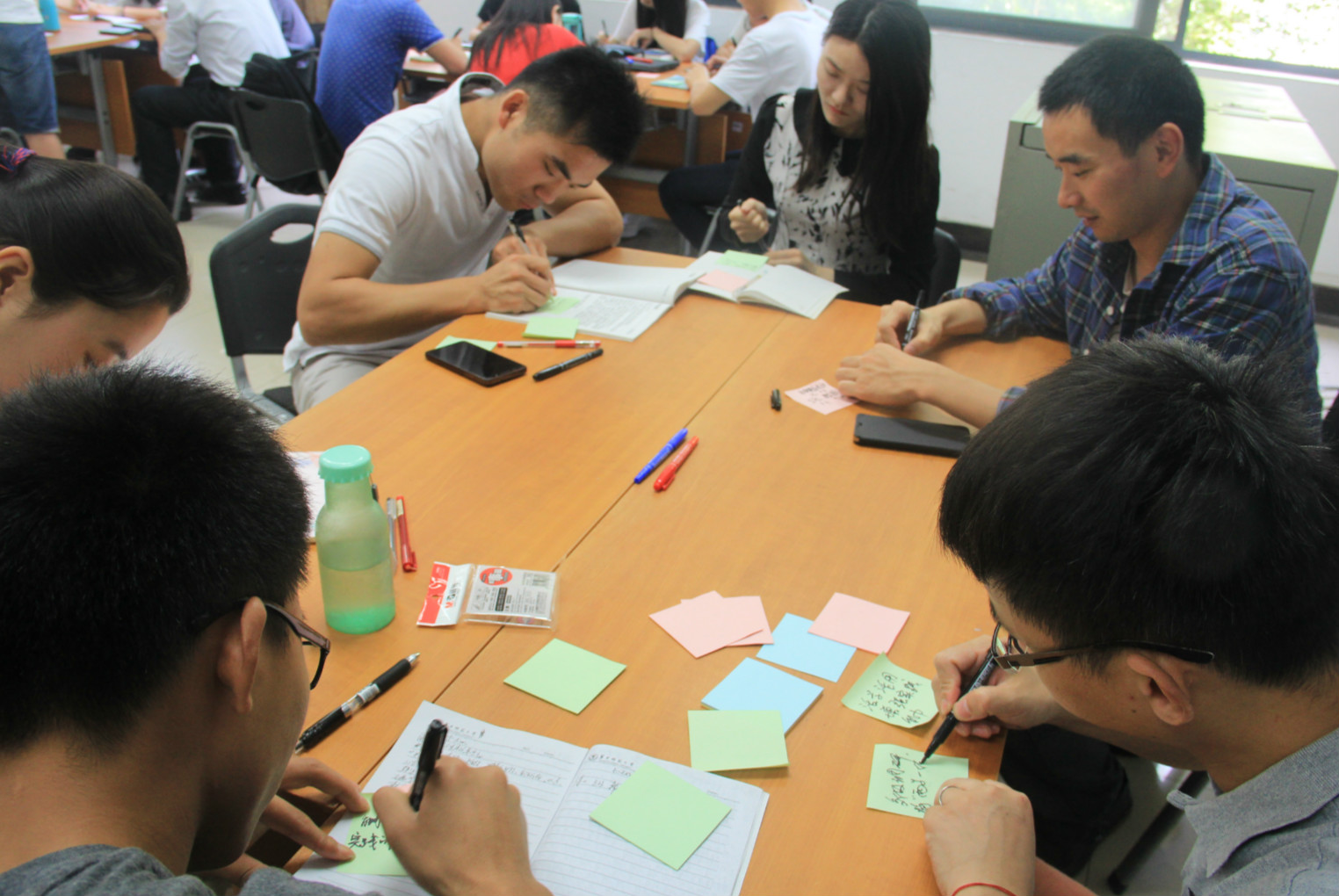党课伊始,主讲人袁教授借助“报数”小游戏将参与者分为五组,分组结束后小组成员通过自我介绍的形式相互熟悉,接下来的课程以小组的形式开展。袁方成教授说:“针对我支部基层党员在‘两学一做’学习教育中的经验与问题,我支部决定运用开放空间会议技术创新党课形式,推进党建工作不断创新,不断增强党的影响力与凝聚力”。按照开放空间会议技术操作要求,主讲人设置了五个问题分别为:在‘两学一做’学习教育中,你的收获是什么?你的期待是什么?你的担心是什么?你能做什么?针对不同问题,参与者将自己的观点写在不同颜色的卡片上,然后张贴在墙壁上,相同的观点纵向帖,不同的观点横向贴,最后由代表总结大家的观点。