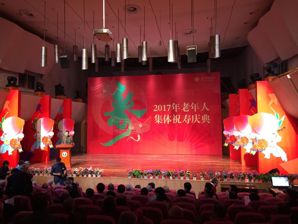 杨宗凯校长首先致贺词,向出席庆祝活动的312位寿星和离退休老人代表致以节日的问候和良好的祝愿。他表示尊老敬老是中华民族的传统美德,党和国家十分重视老龄工作,习近平总书记在党的十九大报告中明确提出:要提高保障和改善民生水平,健全老年人关爱服务体系。同时杨宗凯校长指出,学校当前正处在加强内涵建设的关键期,他期盼各位老领导、老同志一如既往地关心支持学校的建设和发展,继续贡献智慧和力量。为老服务工作的同志们更要积极主动研究探索当前离退休工作面临的新情况、新问题,认真总结学校离退休工作的成绩和经验,求真务实、开拓创新、不断提高离退休工作的科学化水平。最后杨宗凯校长强调学校将继续发扬敬老尊老的传统美德,不断创造条件,完善为老服务措施,进一步提高全校老同志的幸福指数,共同创造更加美好的明天。之后老寿星代表上台发言,在发言中介绍了自己退休以来的情况,同时阐述了对幸福的三点体会,即要生活充实,被人需要,身体健康。随后全校师生代表代表用美轮美奂的精彩节目为老寿星们献上了一台盛大的演出,大家一起庆祝党的十九大胜利召开。最后我院寿星们在节目演出结束后,拍摄了集体合影,以留念富有意义的瞬间。庆典活动紧凑有序却寓意丰富,受到老教授们的一致好评。