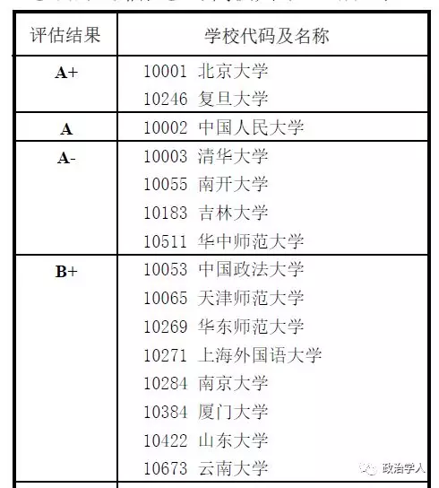 (通讯员 王静文)12月28日,教育部学位与研究生教育发展中心首次采用“分档”方式公布了全国第四轮学科评估结果,我校政治学一级学科被评为A类,排名第四。 本次学科评估中仅有北京大学和复旦大学评估结果为A+,共有7所高校政治学学科评估结果为A类。 下附评估结果榜单: