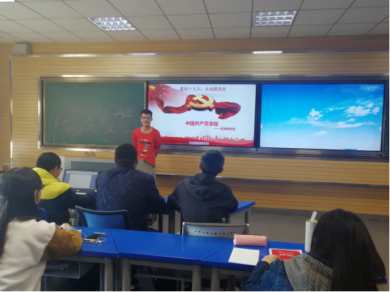 (通讯员:马晓晓)为普及党章知识,贯彻十九大会议精神,10月31日下午两点,我院组织学生集中学习十九大修订之党章。本次活动由本科生团委副书记李一凡主讲,本科14、15、16、17团支部参加。