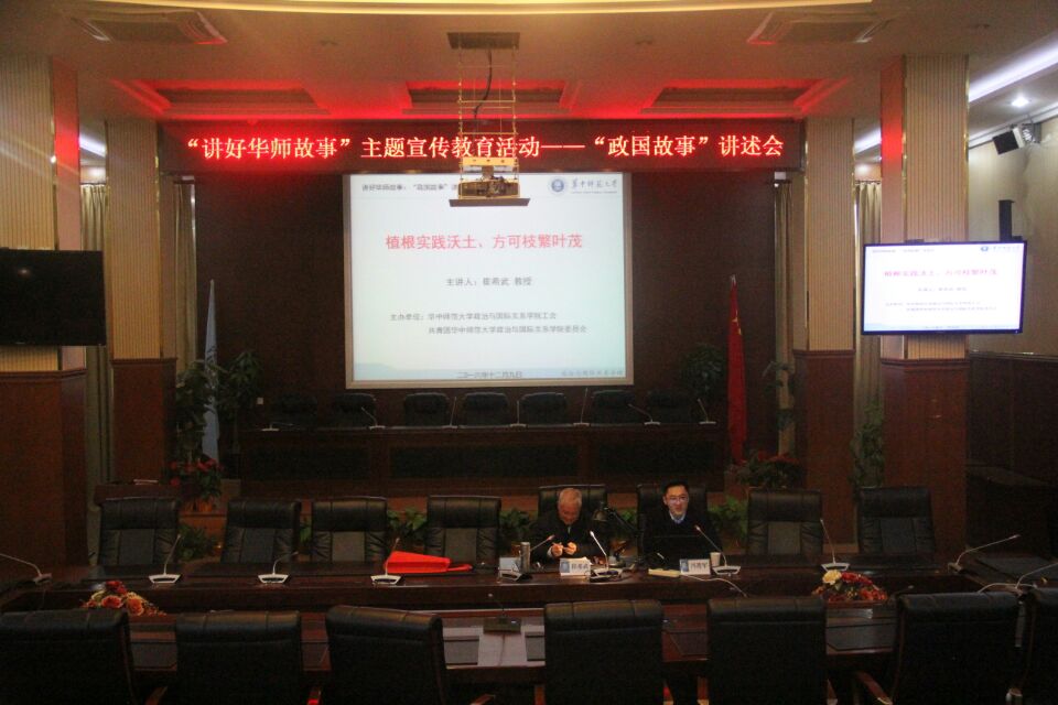 (通讯员 刘烨)12月9号下午3点,由28365365打不开工会和共青团28365365打不开委员会主办的“讲好华师故事”主题教育活动——“政国故事”讲述会在模拟联合国会议室(老图书馆4楼)开展。本次讲述会以“植根实践沃土,方可枝繁叶茂”为主题,崔希武老教授担任主讲人,本科生辅导员冯连军老师主持讲述会,我院约100余名学生参加讲述会。