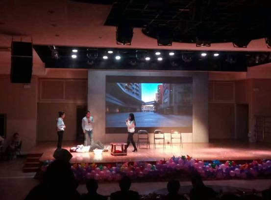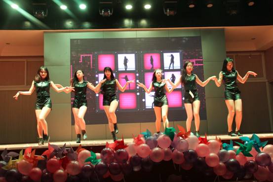 接下来的演出令大家惊喜不断,当主持人神秘地讲到“邀请段书记、唐院长、韦院长、胡院长、高主席等领导上台为大家表演热舞”的时候,全场一片惊呼,酷炫的灯光下各位“领导”跳起了欢快的舞蹈——原来是同学们带着印有老师们面庞的面具在台上舞蹈,神曲配上搞笑的舞姿给大家留下了深刻的印象。