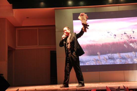 在一组歌曲串烧之后,段维书记上台致辞,并饱含深情地朗诵了《七律·登庐山》《念奴娇·赤壁怀古》两首诗词,经过接下来的唐鸣院长的介绍,大家才知道段书记原来是一位著名诗人。唐鸣院长为大家深情地演唱了一首《天边》,专业的唱功、唯美的唱腔引得了全场响起雷鸣般的掌声,两位老师惊艳的表演把晚会推向了高潮。